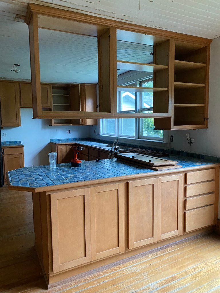 The upper cabinets are in perfect condition so I’ll use them for a different project. The lower set I intend to salvage and paint a custom color with a new countertop. Oddly enough this will be the second set of tile counters we have removed in under 6 months, but that is for another day.